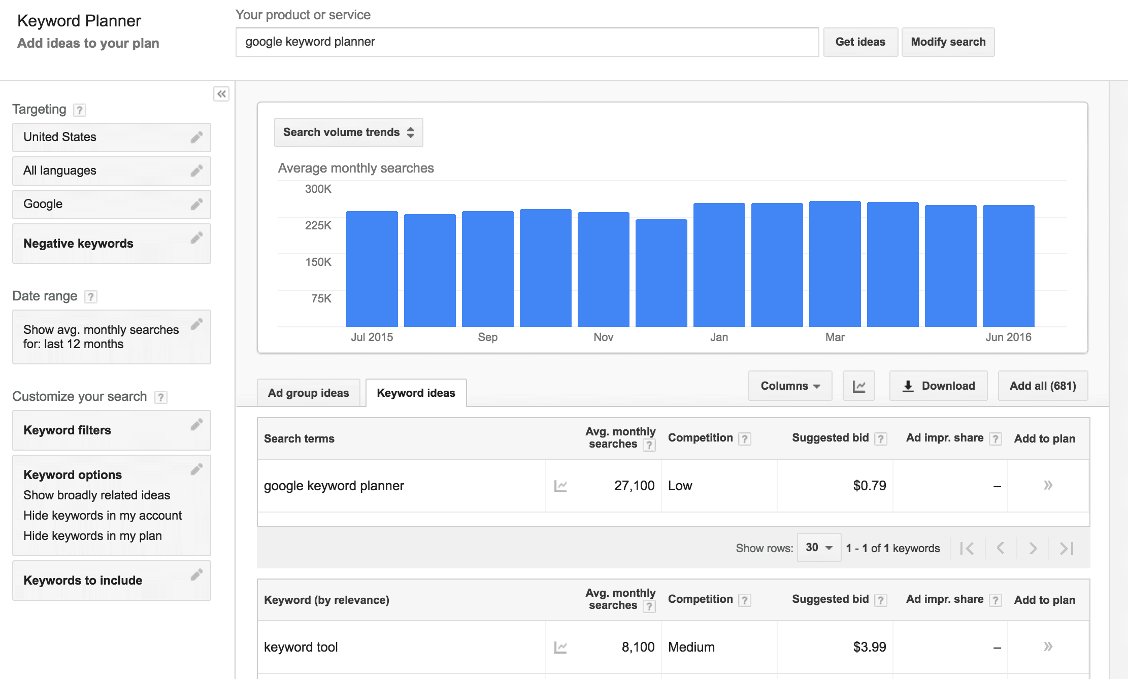 El planificador de palabras clave nos dirá también cuántas búsquedas reciben las palabras clave o términos de búsqueda que escogeré para mi campaña. Esto me dará una pauta también de la cantidad de personas que están buscando efectivamente los productos o servicios que yo estoy ofreciendo. También me dará una oferta sugerida que yo debo hacer para comenzar a tener visitas en mi sitio a través la publicación de anuncios por cada palabra clave. De todos modos, en la práctica esto muchas veces difiere de la realidad y es posible optimizar los resultados a medida que se corre una campaña.